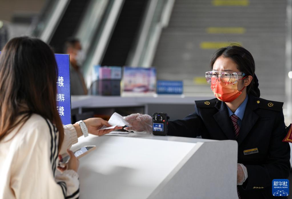 10月1日,中铁兰州局银川站客运员史亚营(右)在车站服务台为旅客提供帮助。