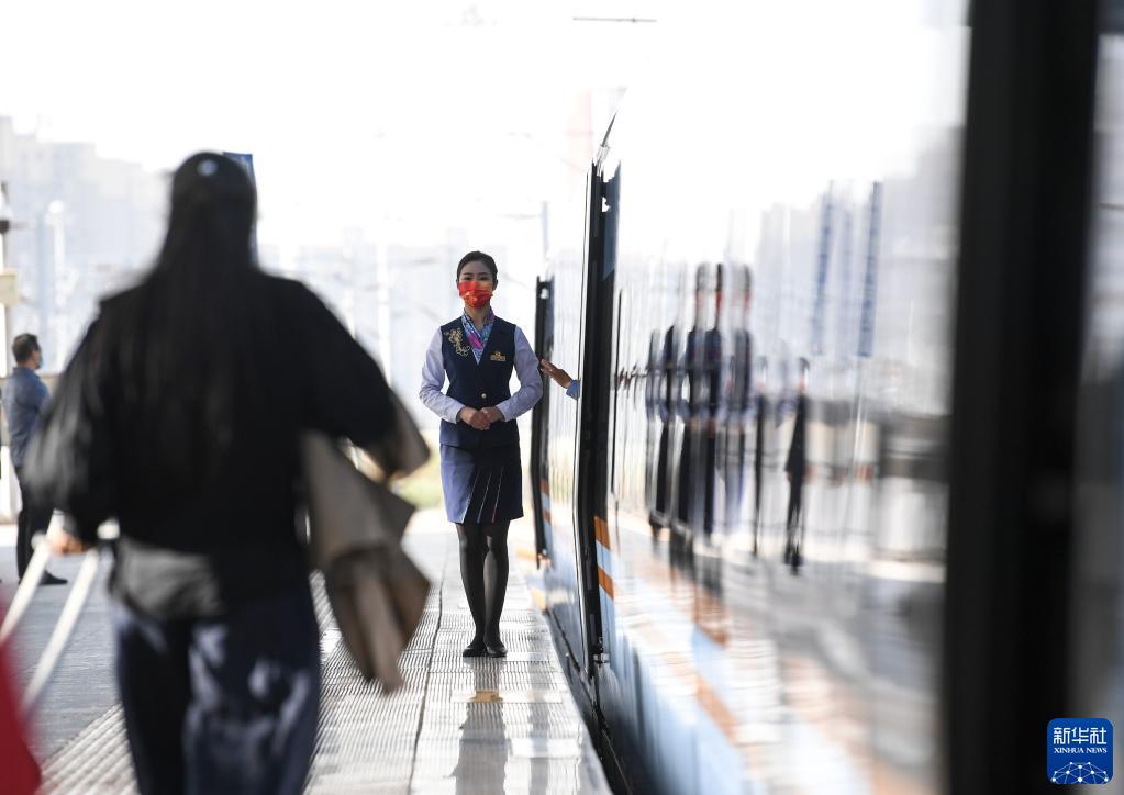 10月1日,中铁兰州局银川站乘务员马晨晨(右)等待乘坐银川开往西安北的D3511次列车的旅客乘车。
