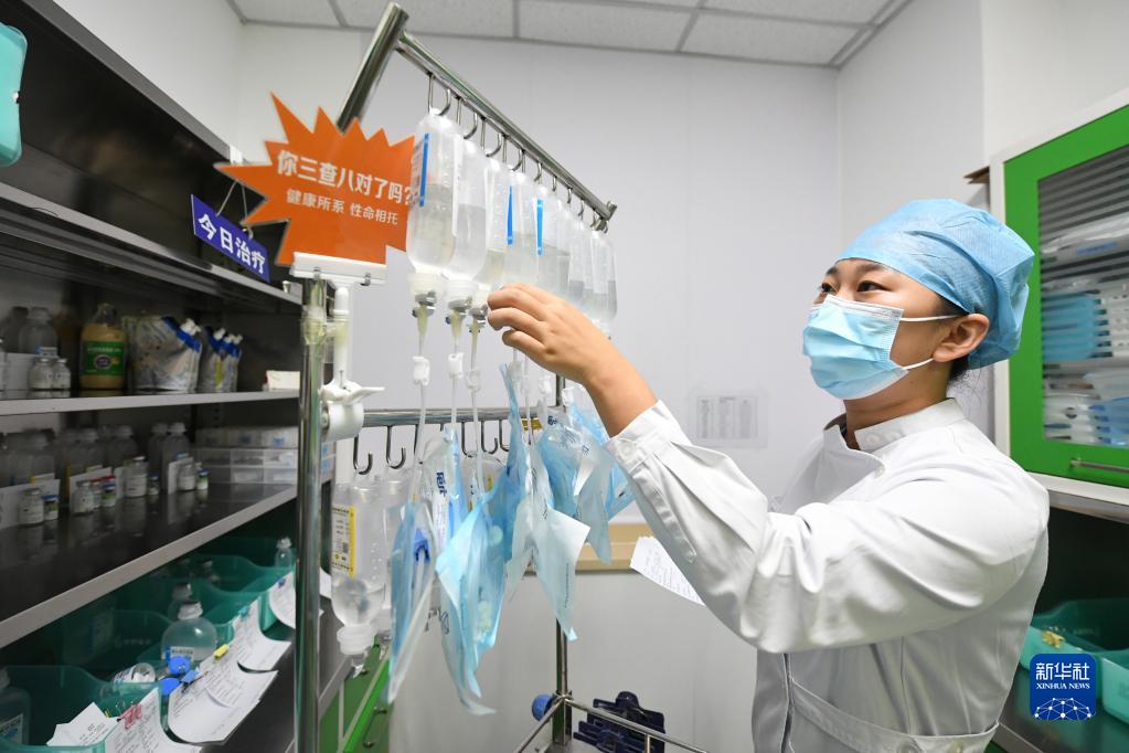 10月1日,在北京市海淀医院急诊治疗室,护士杨楠核对患者药物信息。