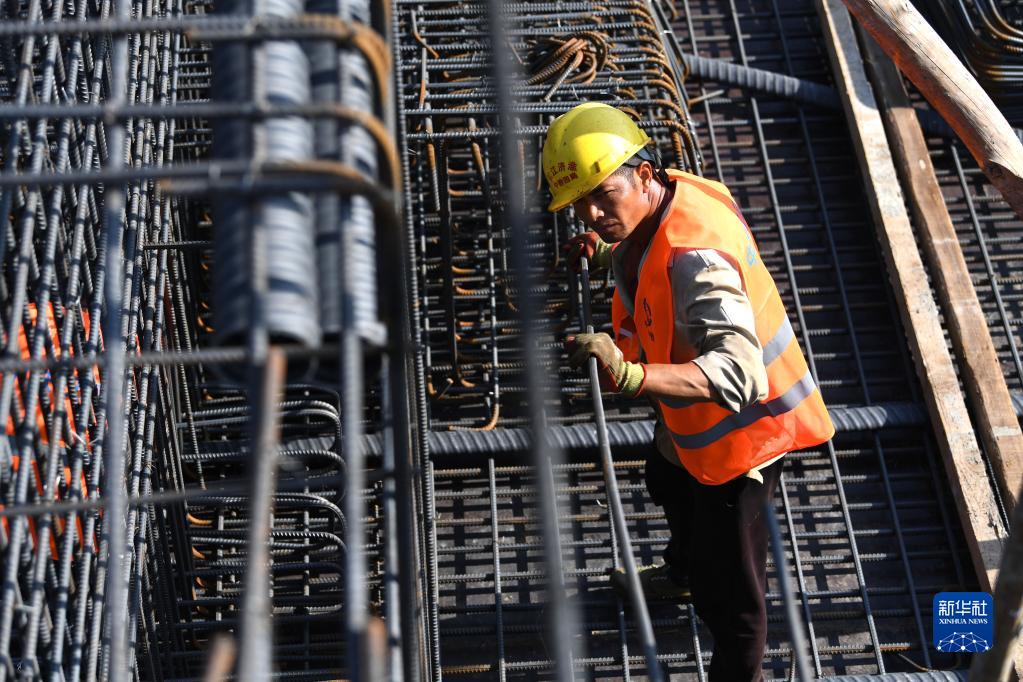 10月1日,中铁四局四公司工人在合肥市引江济淮工程江淮沟通段玉兰大道桥施工现场作业。