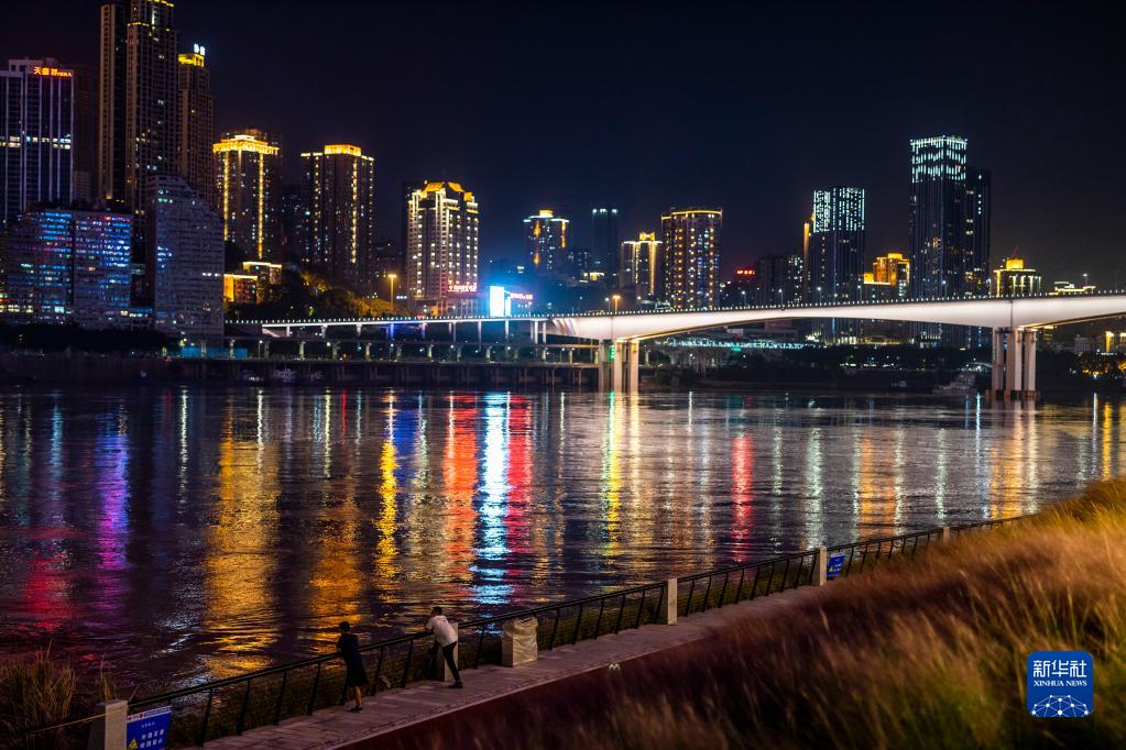 市民在重庆江北区的嘉陵江滨江步道上欣赏夜景(9月30日摄)。