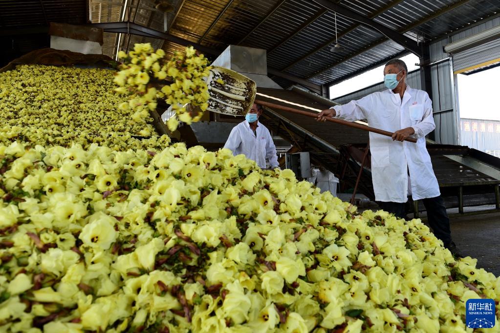 10月1日,村民在安徽省阜阳市颍上县五十铺乡黄蜀葵花烘干车间把黄蜀葵花送进烘干机。