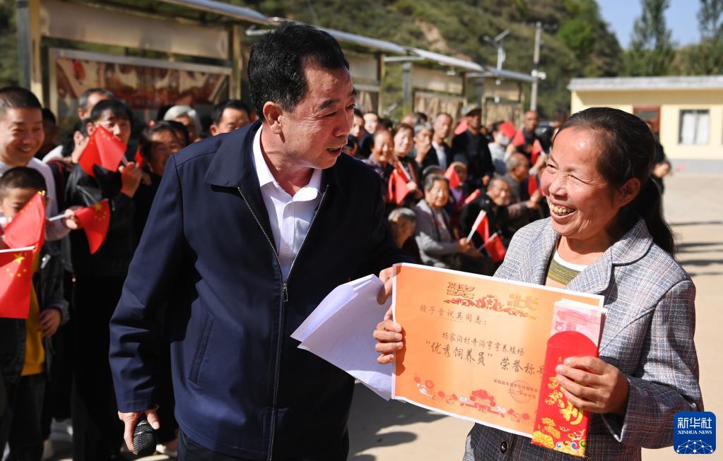 10月1日,陕西省榆林市米脂县杨家沟村“第一书记”朱兆飞(前左)向优秀饲养员雷祝英颁发奖金与奖状。当日,杨家沟村寺沟亨亨养殖专业合作社召开全体股民分红大会,发展黑毛土猪养殖的37万元红利和奖金分到95股280名村民手中。