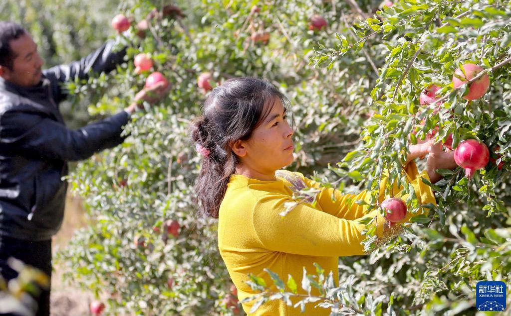 10月1日,新疆和田地区策勒县策勒乡托帕村的村民在采摘石榴。
