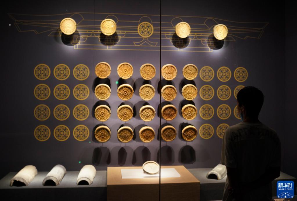 10月1日,参观者在南昌汉代海昏侯国遗址博物馆的“大秦雄风——秦始皇兵马俑展”上观赏“筒瓦、瓦当”。新华社记者 胡晨欢 摄