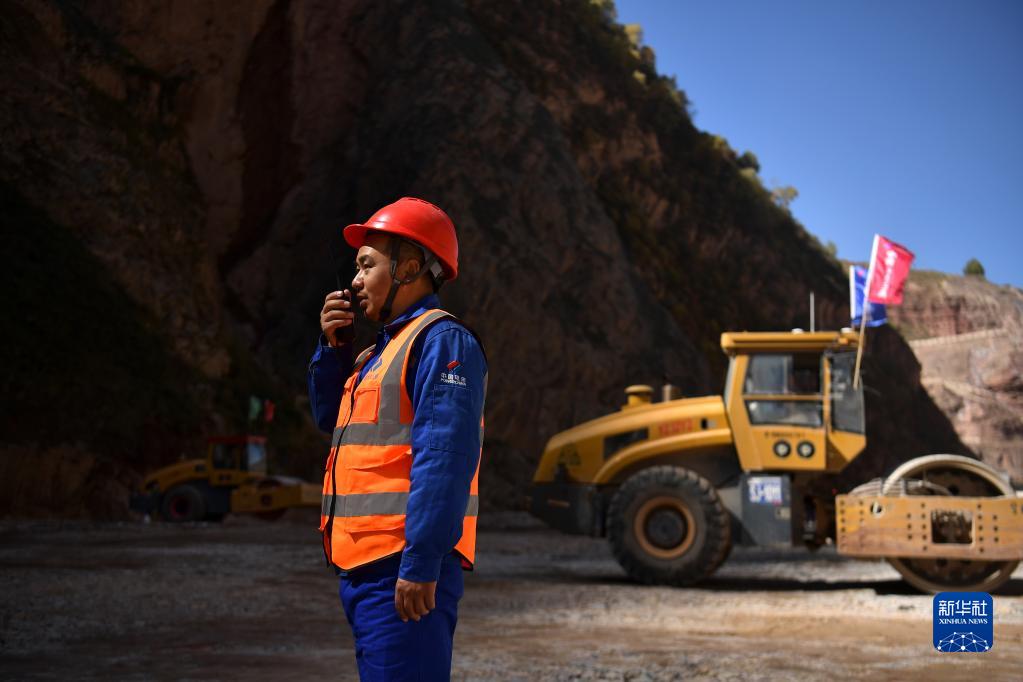 10月1日,水电三局现场施工员郭维军在玛尔挡水电站项目现场指挥作业。