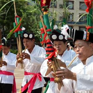 当日,广西三江侗族自治县居民在县城多耶广场表演芦笙踩堂舞,庆祝国庆节的到来。