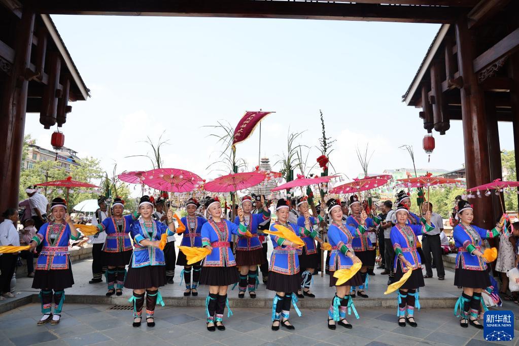 10月1日,三江县居民在表演芦笙踩堂舞。