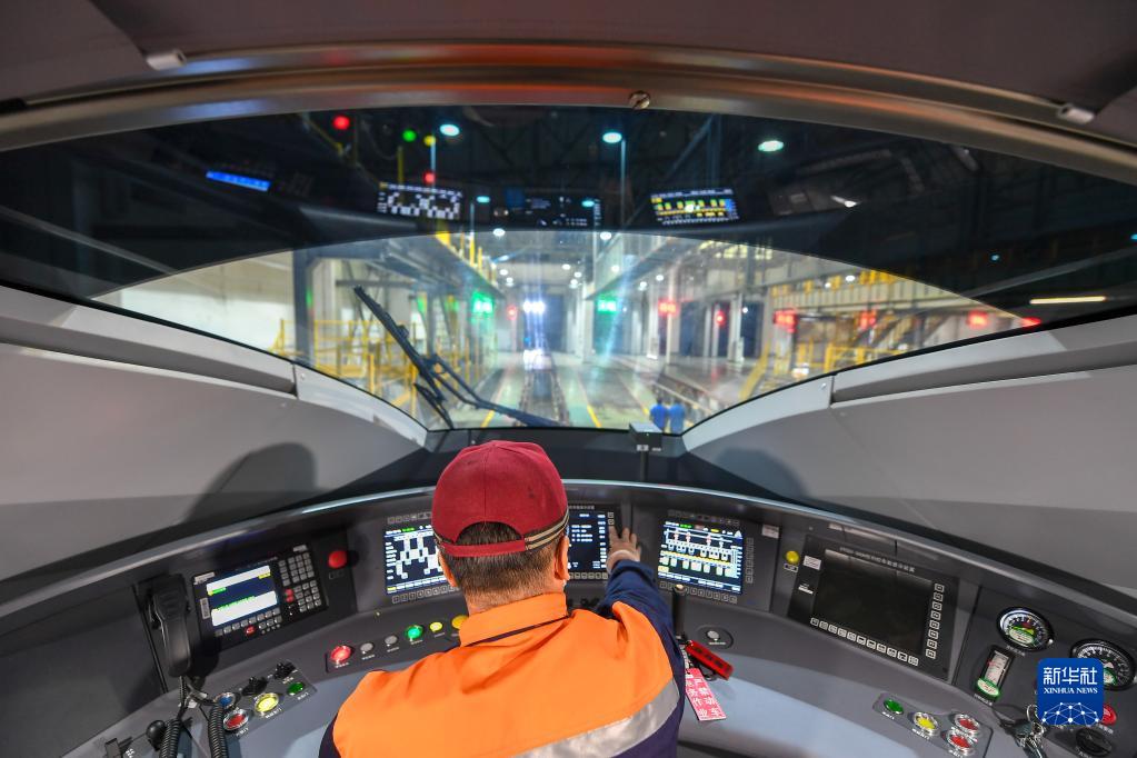 10月1日,贺海龙在高铁驾驶室进行设备数据检测试验。