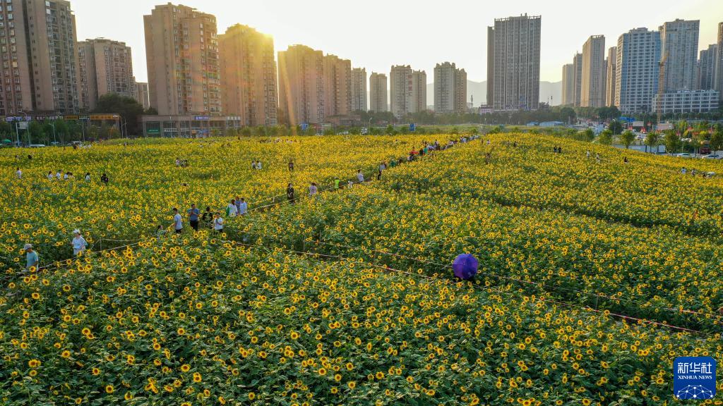 10月1日,游人在重庆市北碚区蔡家智慧新城旁的向日葵花海中赏花(无人机照片)。