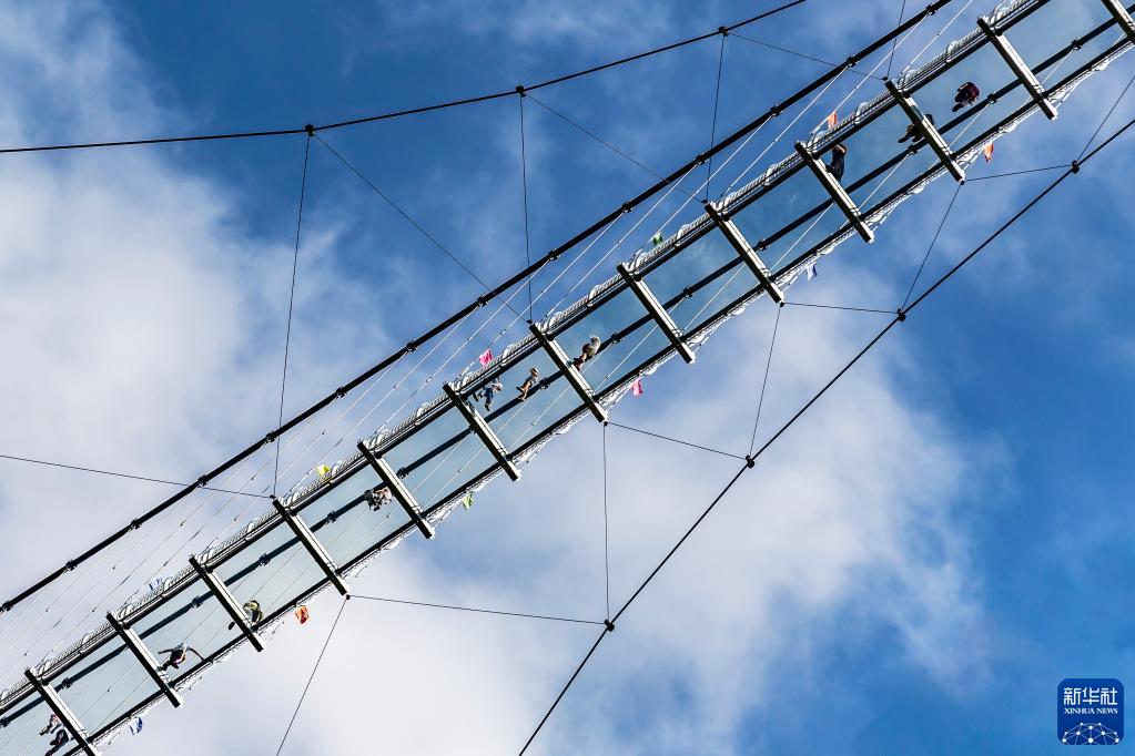 10月2日,游客在贵阳市开阳县南江大峡谷景区体验空中天梯。