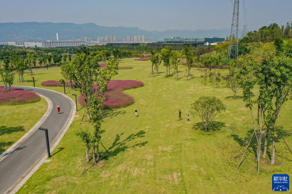 10月2日,人们在重庆市两江新区粉黛山公园游玩(无人机照片)。