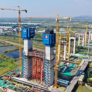 10月2日拍摄的南京仙新路长江大桥北主塔下横梁混凝土浇筑现场(无人机照片)。