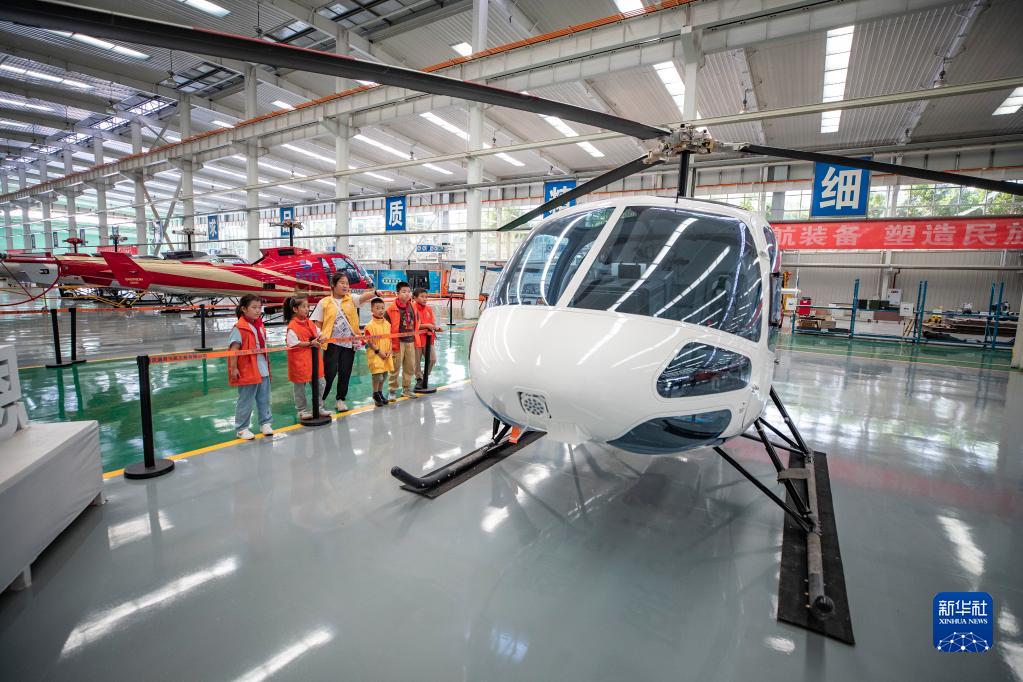 10月2日,在科普活动课上,孩子们在重庆通用航空产业集团有限公司的直升机生产线上参观。