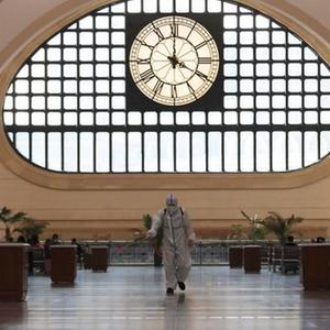 10月2日,在哈尔滨音乐公园,工作人员对垃圾箱进行消毒。