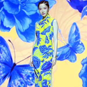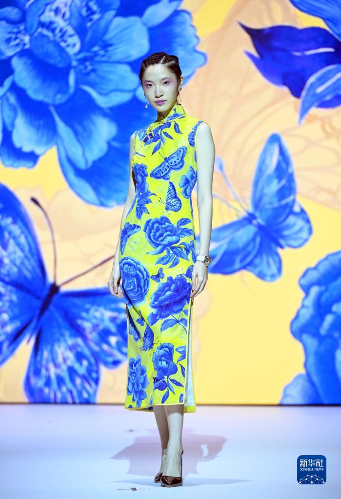 “80后”旗袍设计师余婳设计的“十全十美青花蝴蝶牡丹旗袍”在香港会展中心展示(2021年9月摄)。