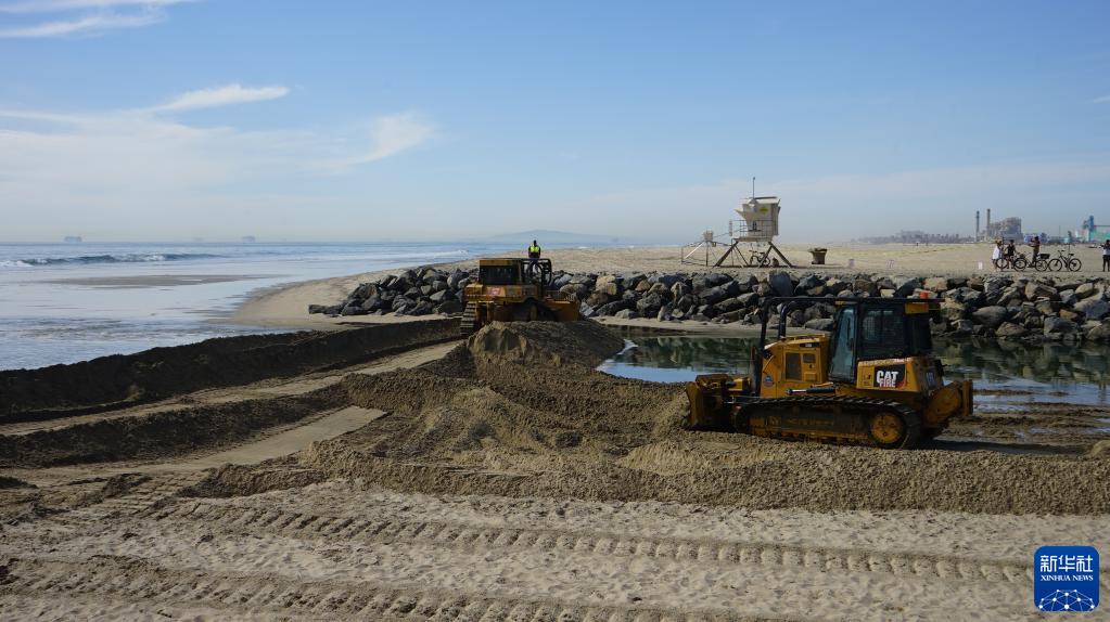 10月3日,工作人员在美国加利福尼亚州奥兰治县一条河道与海滩连接处筑造沙堤,防止原油污水向内陆渗透。