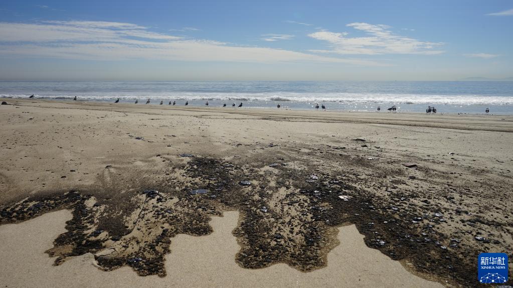 这是10月3日在美国加利福尼亚州奥兰治县亨廷顿比奇市的海滩拍摄的原油污迹。