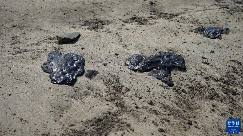这是10月3日在美国加利福尼亚州奥兰治县亨廷顿比奇市的海滩拍摄的原油污迹。