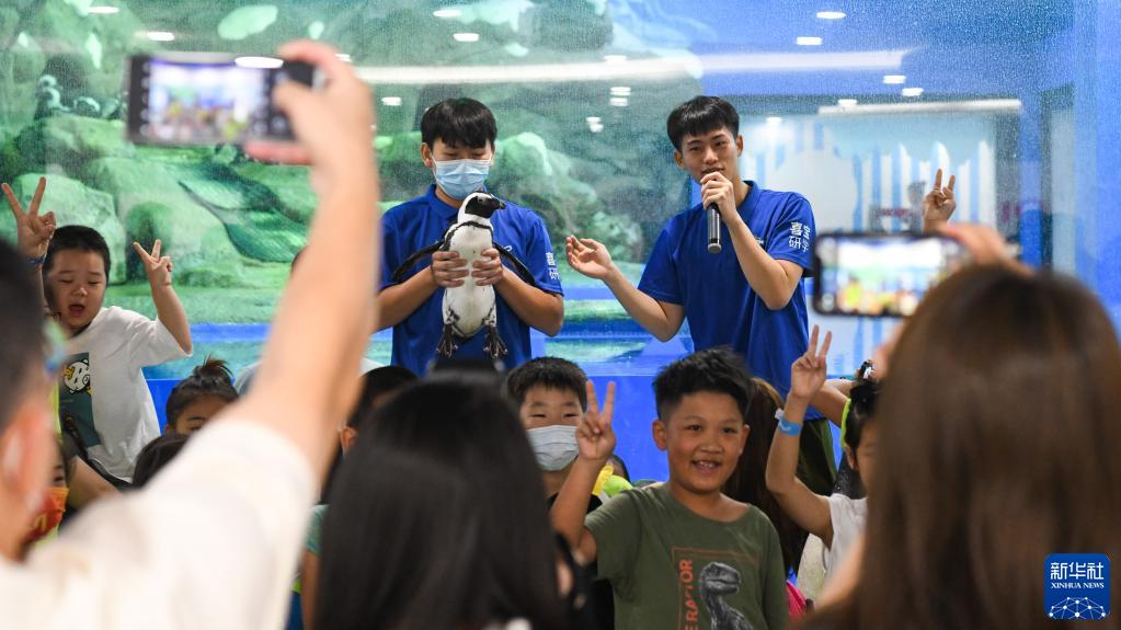 黎瑞禧(右)组织小朋友同馆内出生的首只人工孵化企鹅“喜宝”合影(10月3日摄)。新华社记者 杨冠宇 摄