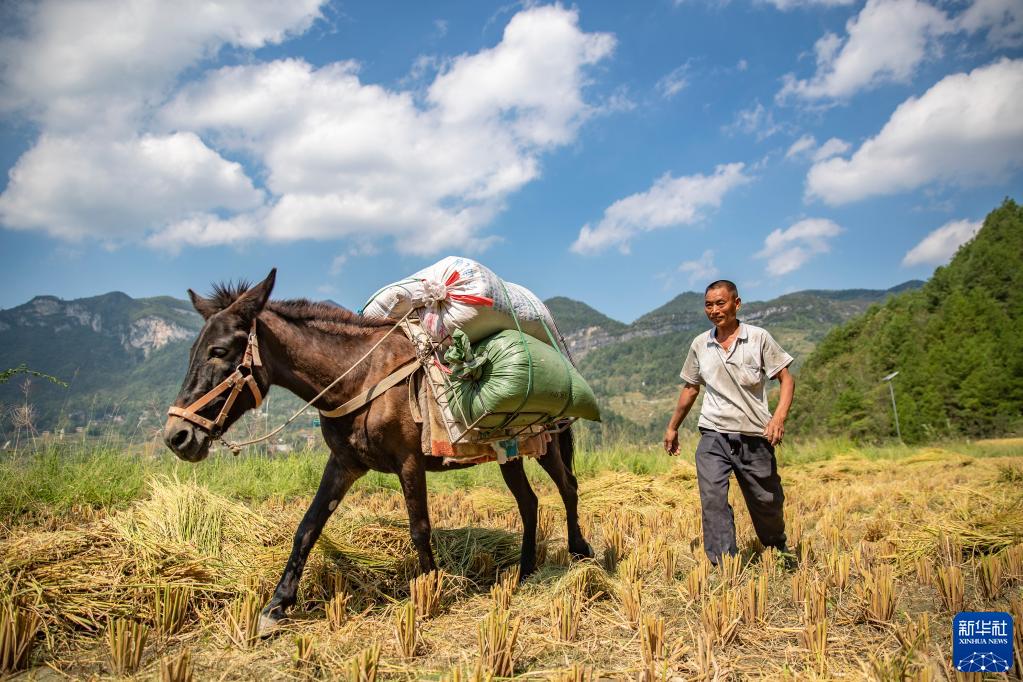 10月3日,在重庆市酉阳土家族苗族自治县花田乡何家岩村,村民将收割的稻谷用骡子驮运到公路上。
