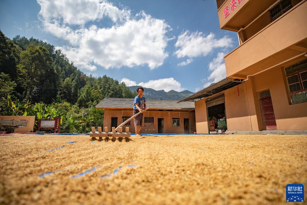 10月3日,在重庆市酉阳土家族苗族自治县花田乡何家岩村,村民在晾晒水稻。