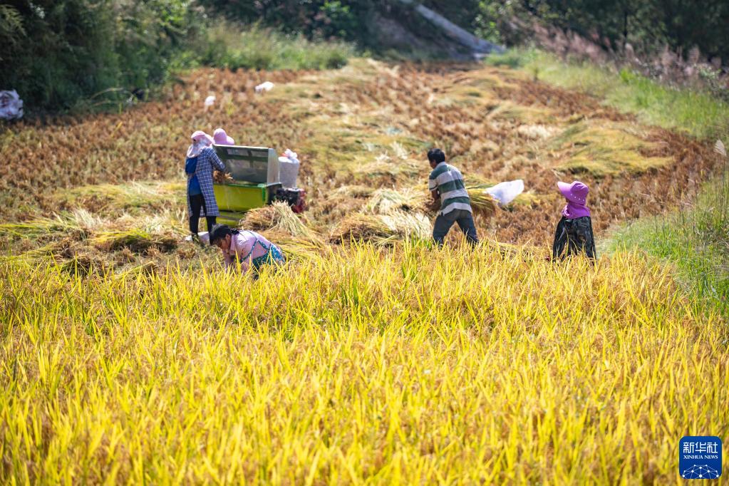 10月3日,村民们在重庆市酉阳土家族苗族自治县花田乡何家岩村收割水稻。