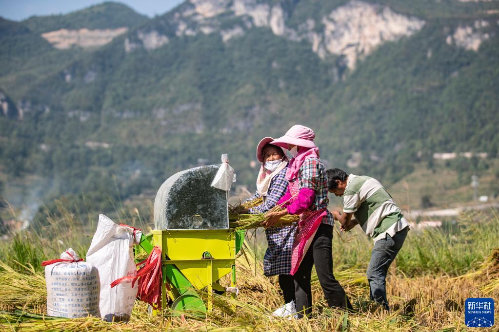 10月3日,在重庆市酉阳土家族苗族自治县花田乡何家岩村,村民在梯田里用机械将收割的水稻脱粒。
