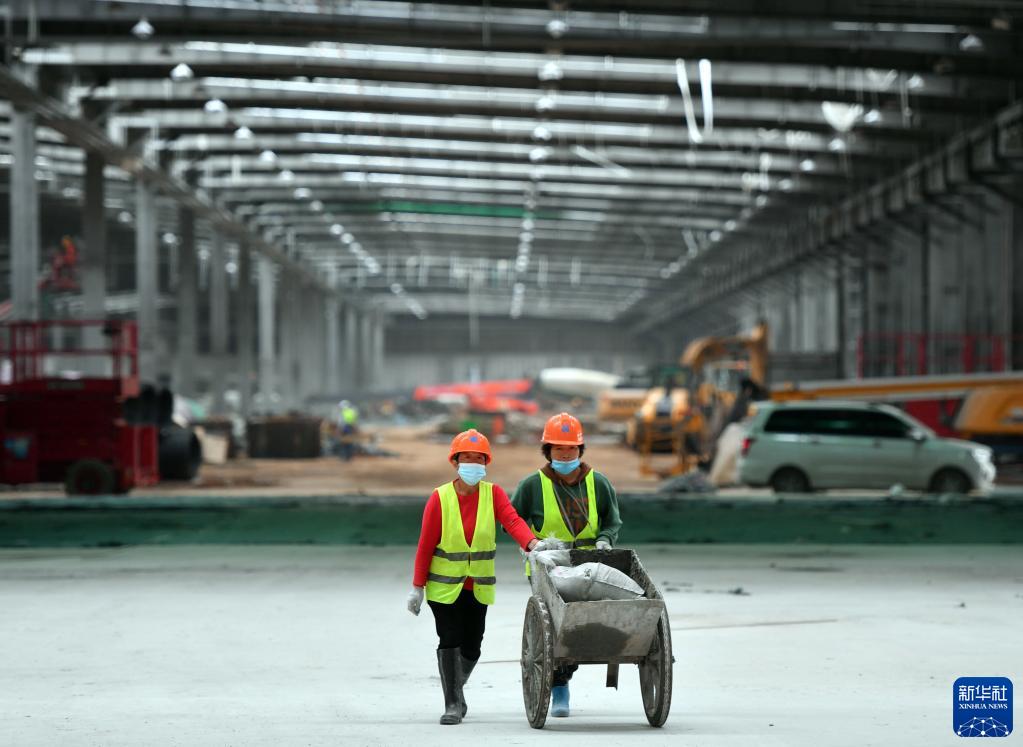 10月4日,工作人员在中建三局承建的郑州新郑国际机场三期扩建工程北货运区项目施工现场搬运物料。