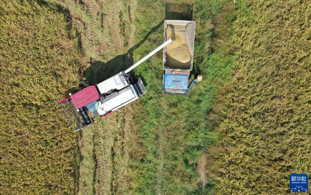 在江西省南昌县蒋巷镇,当地农户将刚收获的稻谷装车(10月4日摄,无人机照片)。