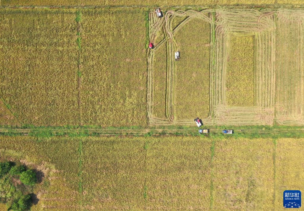 在江西省南昌县蒋巷镇,当地农户收割中稻(10月4日摄,无人机照片)。
