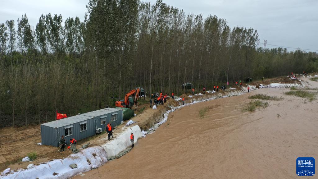 10月4日,在山东省东营市东营区,抢险人员在黄河麻湾段加固防汛堤坝(无人机照片)。