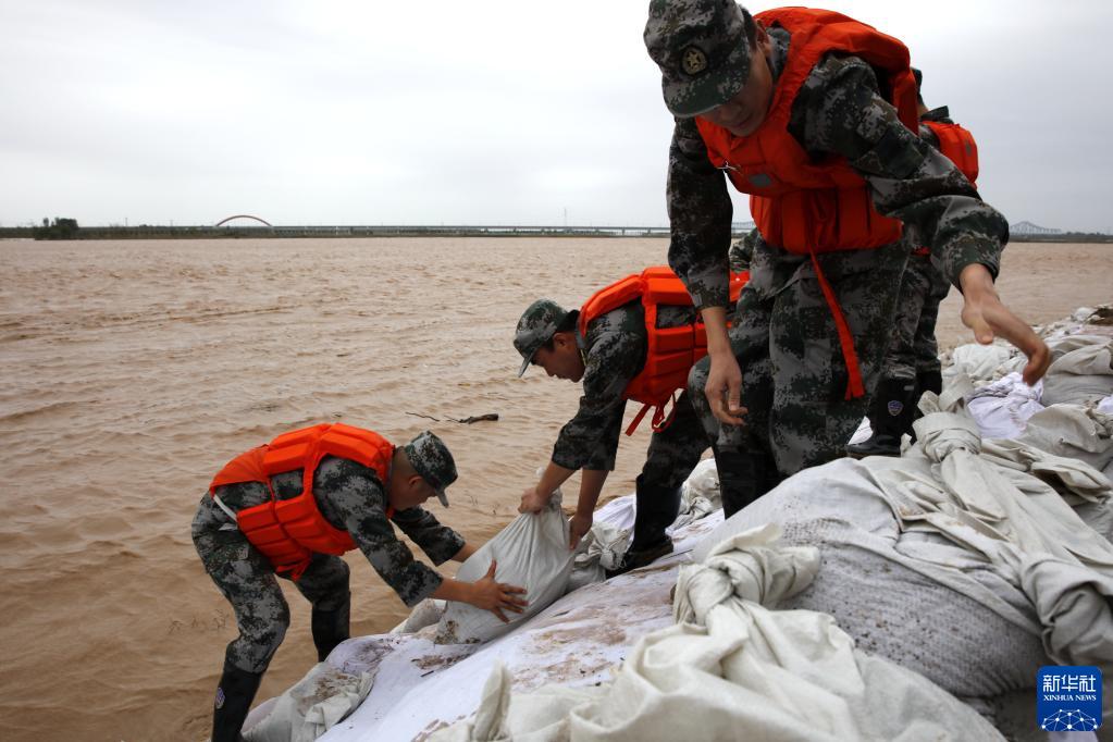 10月4日,在山东省东营市东营区,抢险人员在黄河麻湾段加固防汛堤坝。