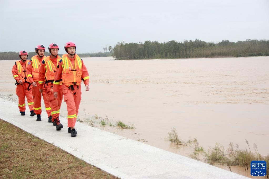 10月4日,在山东省滨州市博兴县黄河河段,博兴县消防救援大队消防员巡视汛情。