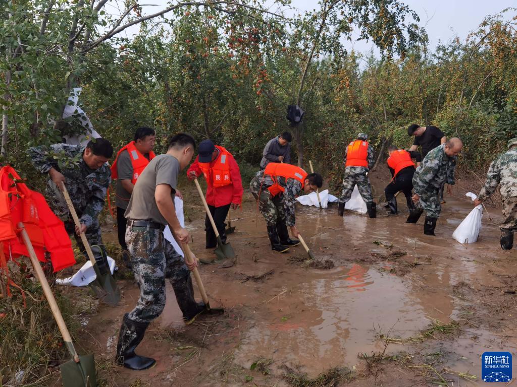 在山东省滨州市博兴县黄河河段蔡寨黄河滩区,博兴县党员志愿者与基干民兵加固生产堤(10月2日摄,手机照片)。