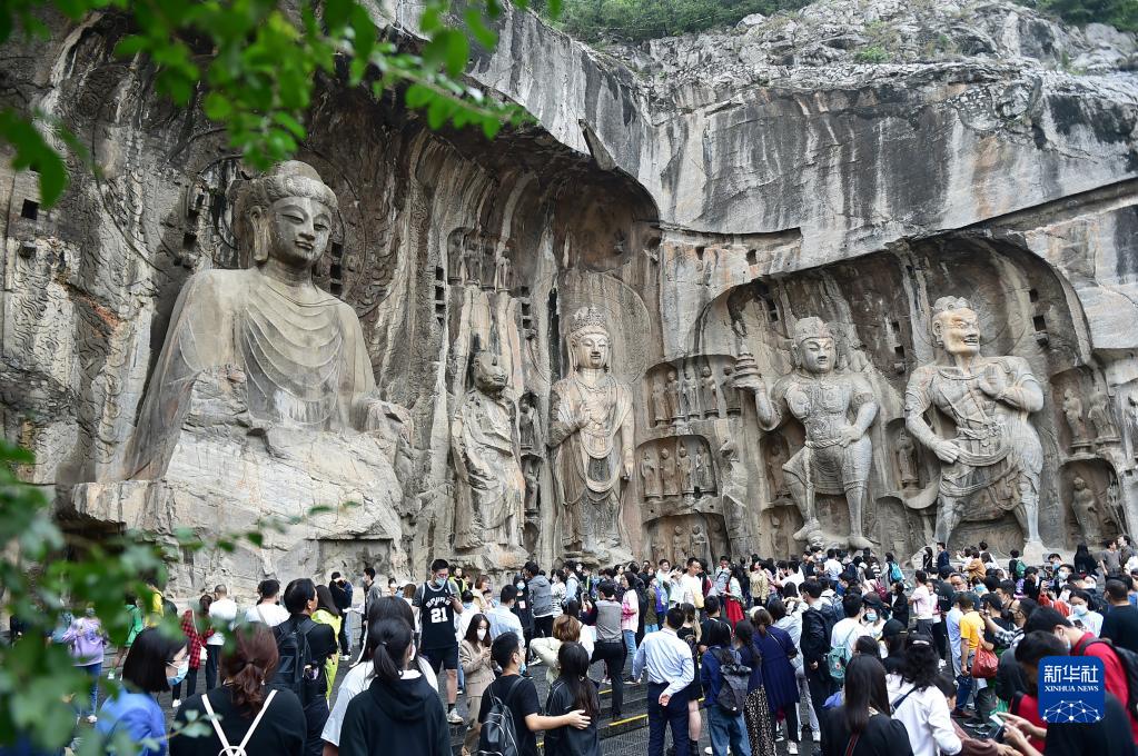 10月4日,游客在参观游览世界文化遗产洛阳龙门石窟。