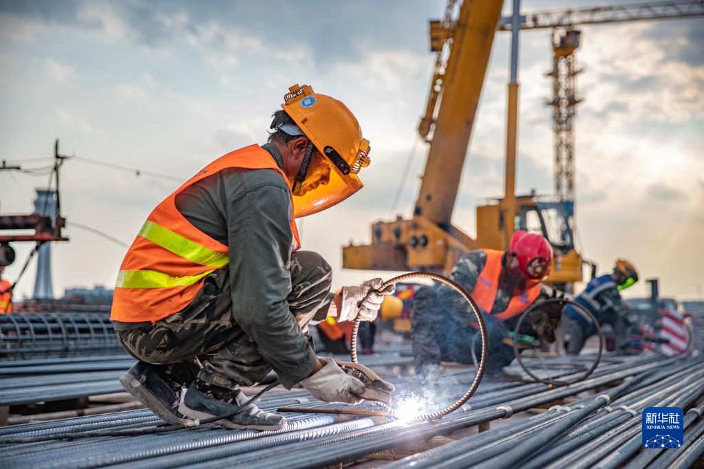10月4日,施工人员在重庆江北国际机场T3B项目上进行钢筋焊接作业。