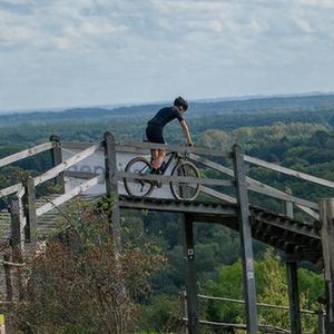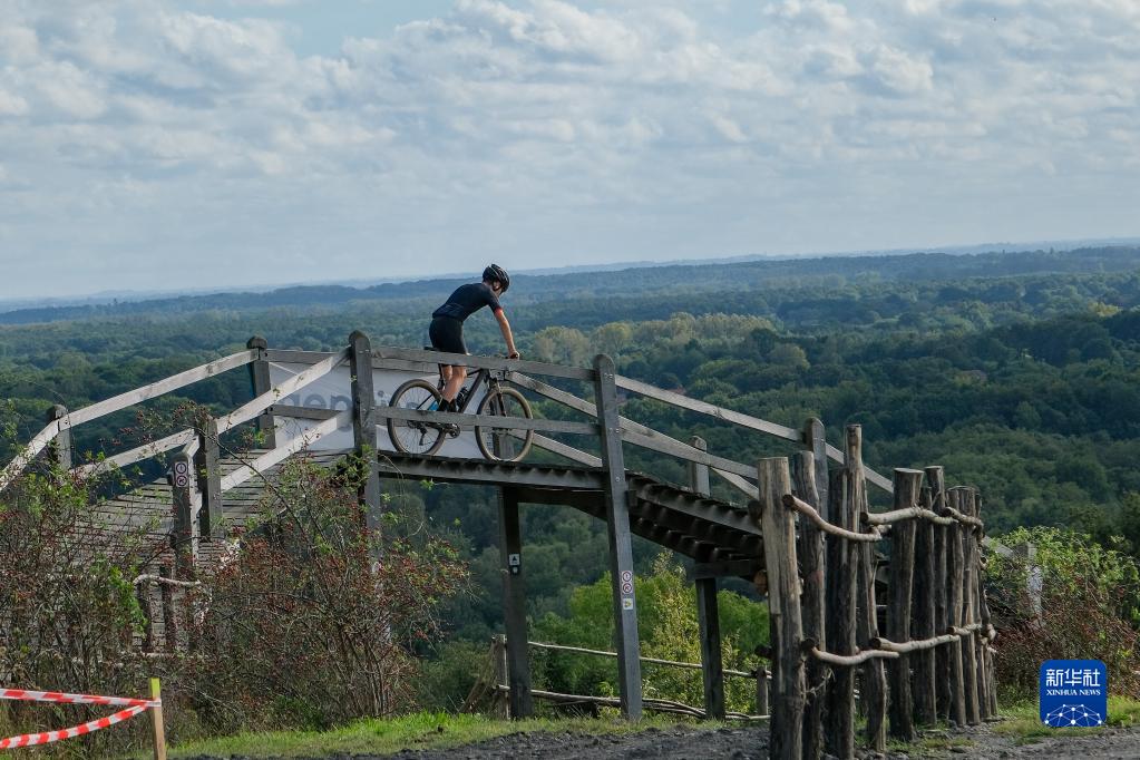 10月4日,在比利时贝灵恩,一名骑行爱好者在be-MINE文旅园区内由矿渣山改造成的“冒险山”游乐场骑行。