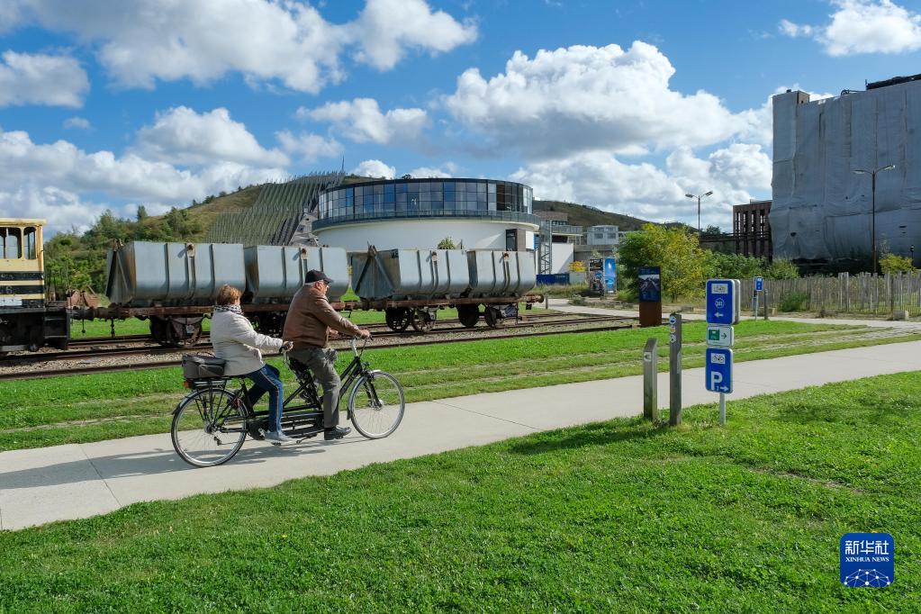 10月4日,在比利时贝灵恩,游客在be-MINE文旅园区内骑行参观。