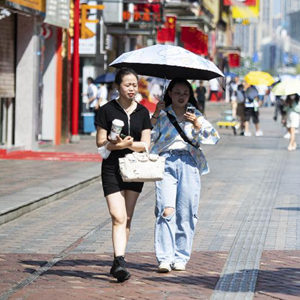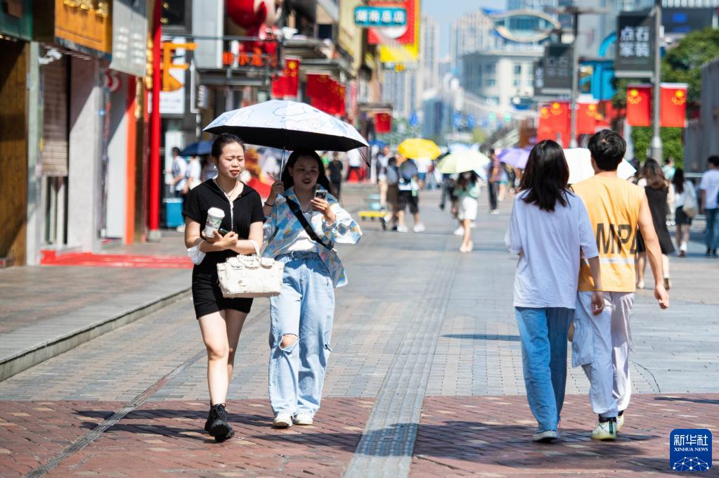 10月4日,行人在湖南长沙黄兴路步行街打伞防晒。