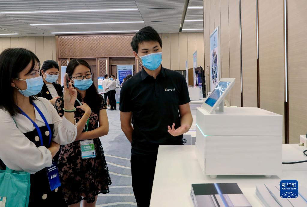 在国家会展中心(上海),第四届进博会食品及农产品展区、医疗器械及医药保健展区展前供需对接会的工作人员在介绍一台测序仪展品(7月26日摄)。新华社记者 方喆 摄