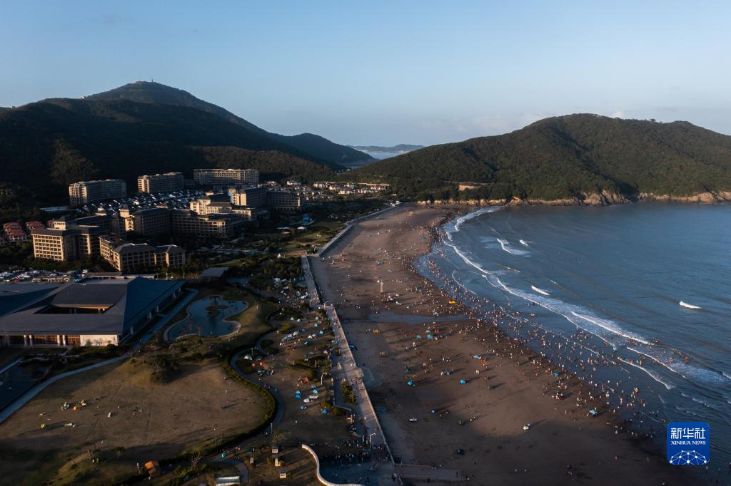 国庆黄金周期间,地处东海之滨的浙江省舟山市素有“碧海金沙”美誉的朱家尖景区迎来了游客高峰。从10月1日至10月5日,朱家尖南沙景区及东沙湾海滨浴场共接待游客近20万人次。据了解,今年国庆节期间的舟山天气持续晴朗,游客出游热情高,景区在接待好游客的同时,做好疫情防控工作,景区秩序井然,游客们在碧海蓝天下感受快乐的假期。
