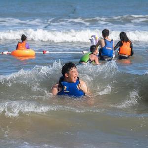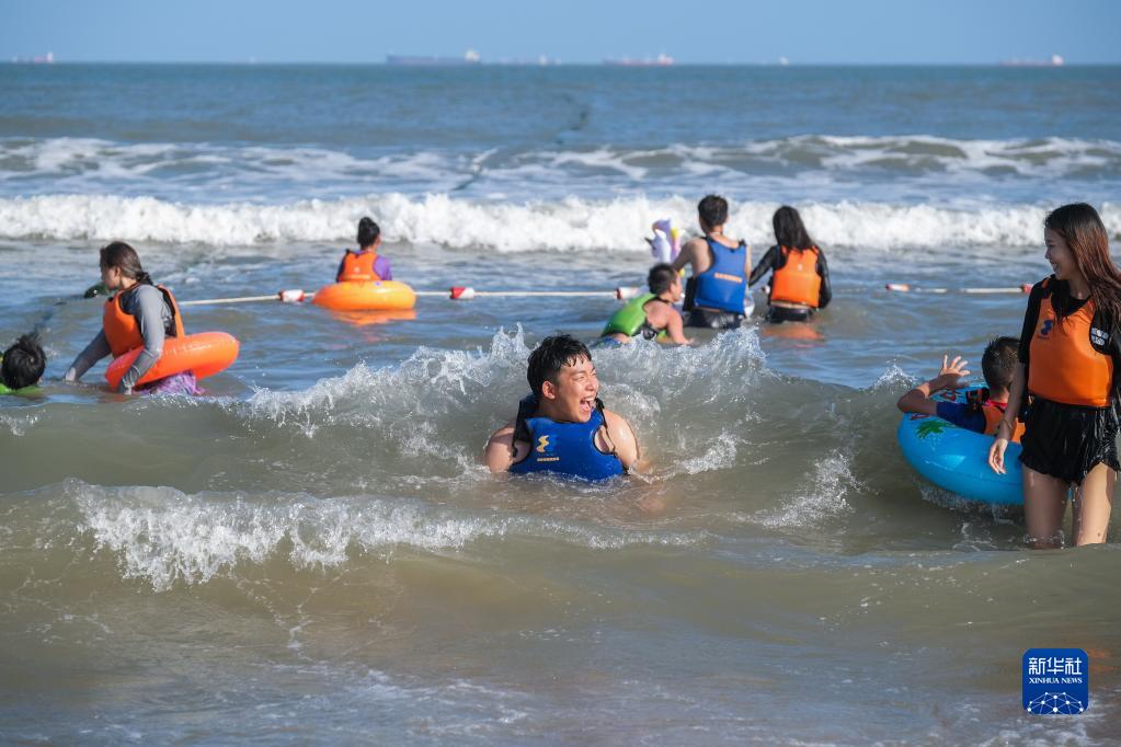10月5日,游客在朱家尖东沙湾海滨浴场游玩。