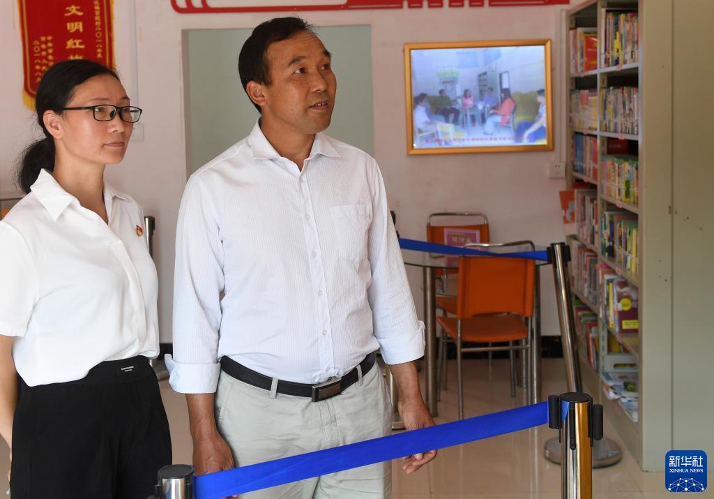 在广西百色市乐业县新化镇百坭村,班统茂(右)在黄文秀先进事迹陈列馆内参观(10月1日摄)。