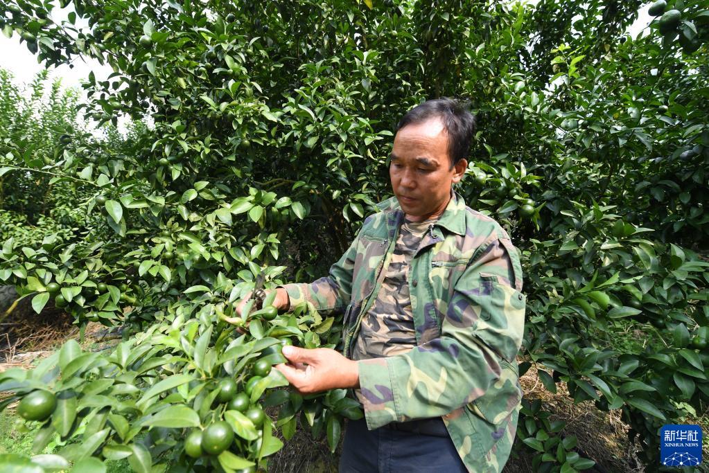 在广西百色市乐业县新化镇百坭村那用屯,班统茂在地里管护砂糖橘(10月1日摄)。