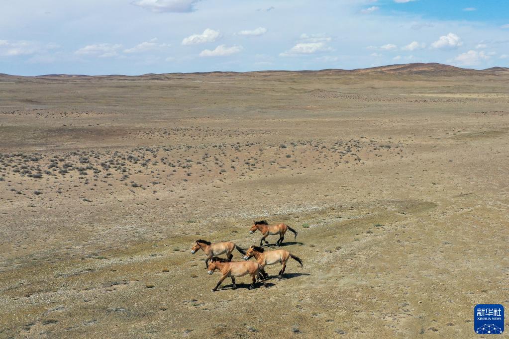 普氏野马在新疆卡拉麦里山有蹄类野生动物自然保护区奔跑(2020年6月3日摄,无人机照片)。