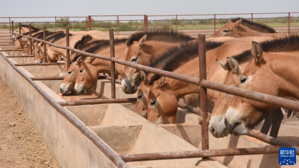 在新疆野马繁殖研究中心,普氏野马在吃“西瓜解暑餐”(8月10日摄)。