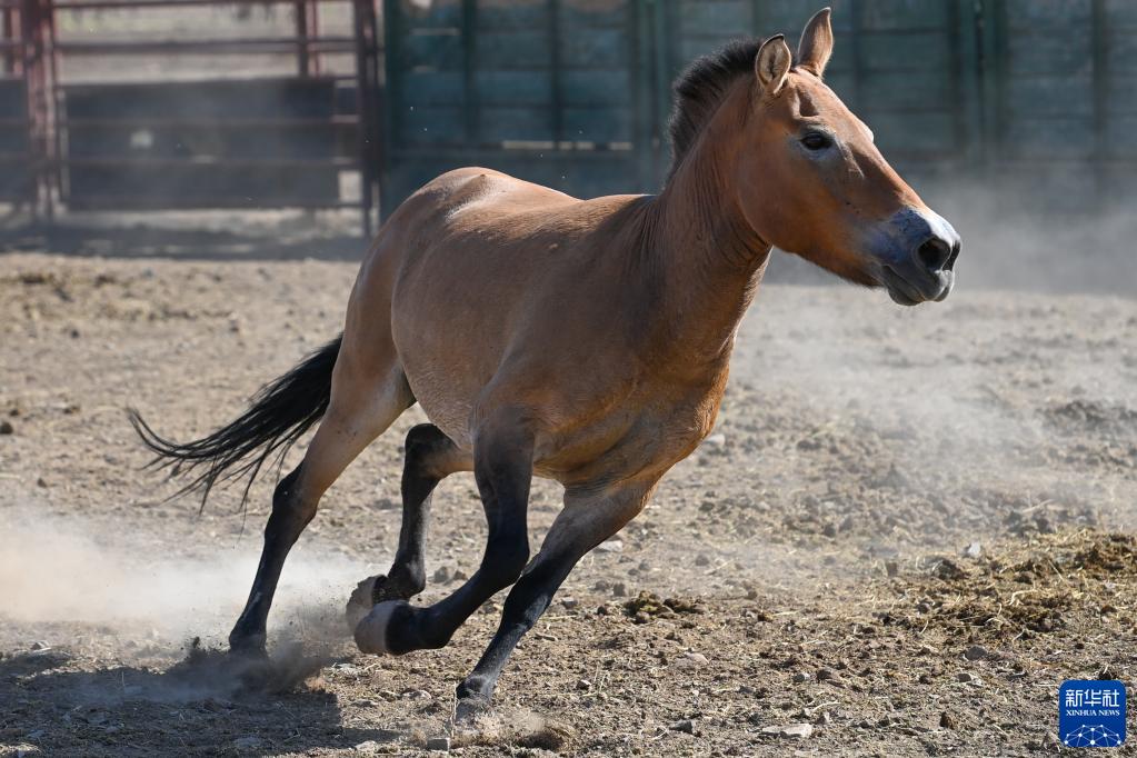 在新疆野马繁殖研究中心,即将放归野外的普氏野马进行适应性训练(8月11日摄)。