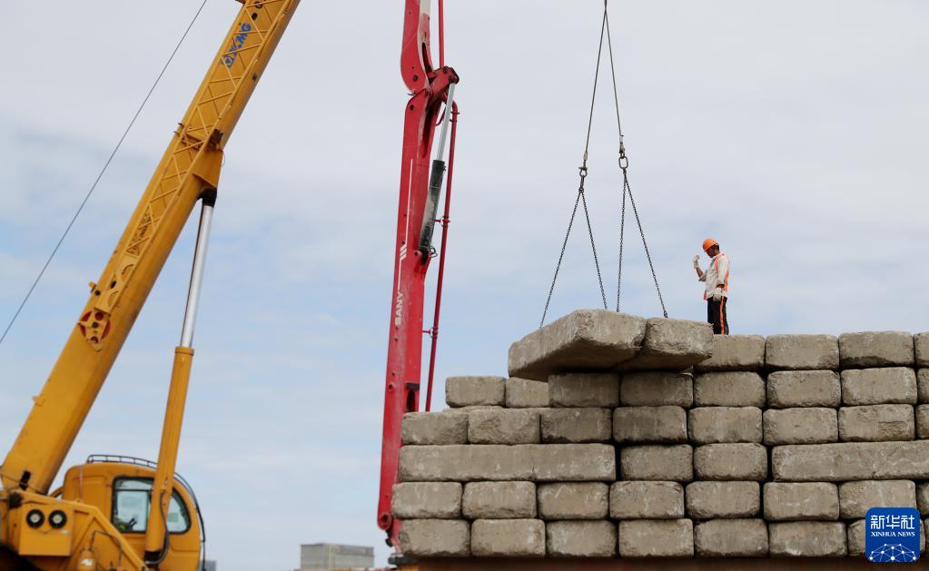 10月6日,在上海浦东新区临港新城滴水湖西岛,一名工人在中银金融中心项目建设工地上指挥吊车作业。