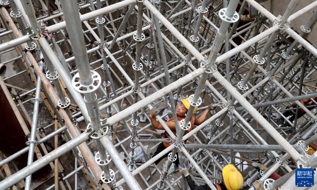 10月6日,在位于浦东新区的上海市轨道交通市域线机场联络线工程张江站建设工地,工人在基坑内的脚手架间作业。